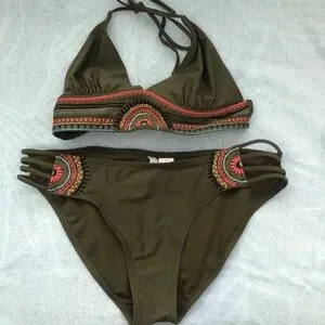 This vibrant green bikini features a halter top and classic cut bottoms, accented with tribal-inspired trim for a stylish contrast. Perfect for making a statement at the beach or pool.