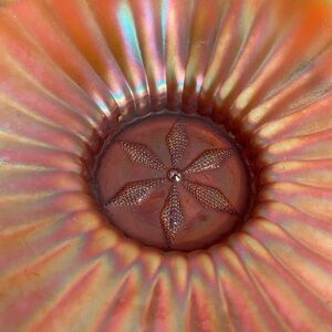 This exquisite vintage carnival glass art dish is a truly collectable piece of art. Created by Dugan Cosmos in the 50’s . It is a 6 petals design with bright iridescent orange encased in white. Measurements in picture.