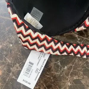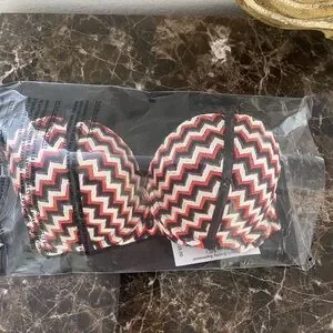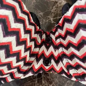 Stylish zigzag bikini top. Features striking black, red, and white pattern. Perfect for a fashionable beach look.