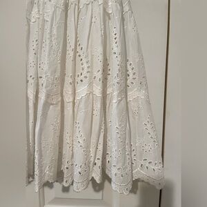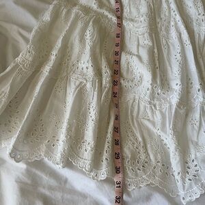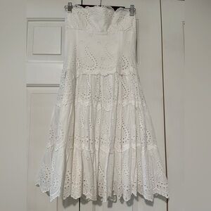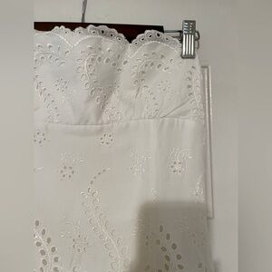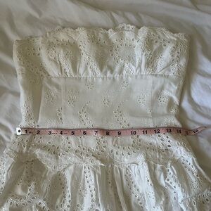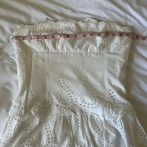 Elegant white strapless dress with eyelet details. Perfect for summer occasions.