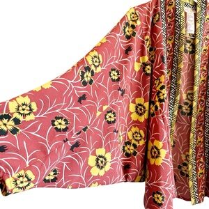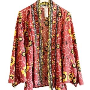 Brighten up your wardrobe with this bold and beautiful Free People Kona Print Kimono in one size fits all. This lightweight, flowy piece features an eye-catching red background with vibrant yellow and black floral designs, accented with a contrasting geometric trim along the open front. Bat wing sleeve. Please see pics it’s not red.