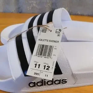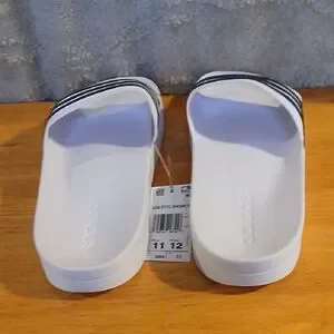 Sleek Adidas slides with iconic black stripes. Ideal for everyday comfort.