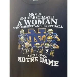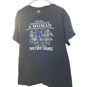 This is a dark blue unisex adult size large shirt featuring sayings related to the Notre Dame Fighting Irish football team. The shirt is officially licensed and is part of the regular season fan apparel. It is made by the brand Gildan and has a sporty aesthetic suitable for football enthusiasts. The shirt is made in the Dominican Republic and is a must-have for fans looking to show support for their favorite college team in a stylish and comfortable way.