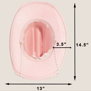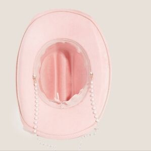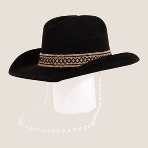 Stylish black cowboy hat featuring a chic pearl chain accent. Perfect for adding a touch of elegance to any outfit.