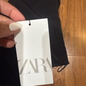 These Zara black skorts feature a sleek, minimalist design with a solid black color and a form-fitting silhouette. The skorts combine the comfort of shorts with the elegance of a skirt overlay, making them a versatile addition to any wardrobe. The simple, flat waistband sits comfortably at the natural waist, offering a clean and polished look.