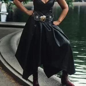 Western Flair, Machine Washable, Size Medium/ Chart Fit 8-10, Measurements Flat: Bust 16"/ with Stretch, Waist 17", Length 54" approx. Asymmetrical Hem Line, Top Stitch Detail, New, Tags, Belt Not Included/ Stock Photo :) Rt.188.00 * Purchased for Wedding Guest Dress, Never Attended. ** This is Beautiful in Person & the Quality of the Faux Leather is Amazing, You can Cut the Tulle off if you don't like the Fullness at Hips ( I read people were removing it /in reviews) you Decide.