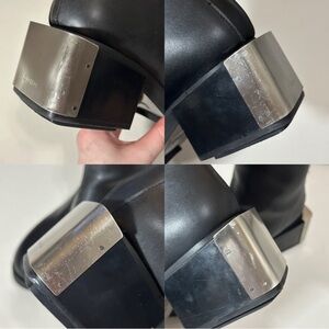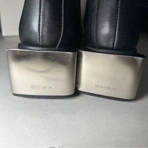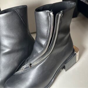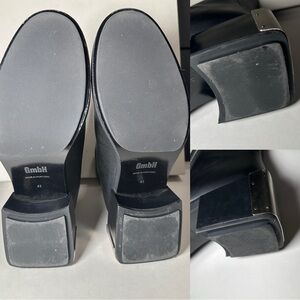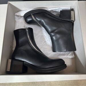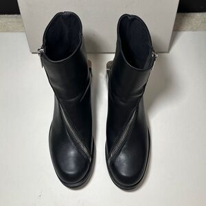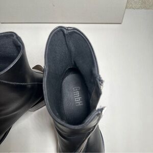 Size 41 GmbH Black Pleather Diagonal zip Heeled Bootie. Minimal signs of wear on heel soles, see pics. Never worn by me, bought resale but decided they don’t fit with my wardrobe! In original box from SSENSE.