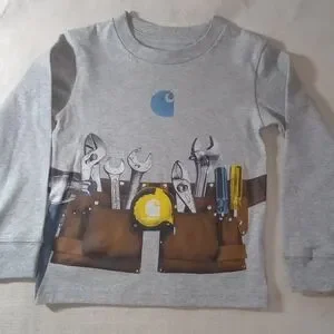 2T Carhartt long sleeve tee with fun tool belt graphic and logo on soft gray fabric. Perfect for your little helper. Built for kids who outplay them all. multiple designs available, create a bundle today!