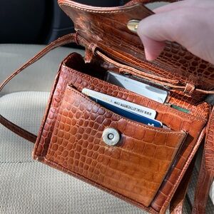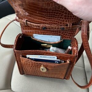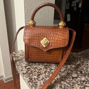 This stylish brown handbag features a luxurious crocodile pattern and gold accents. Perfect for adding a touch of elegance to any outfit.