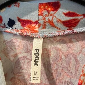 Chic sleeveless dress with vibrant floral pattern. Dress itself is light blue and the flowers are bright reds and oranges. Size is medium and fits as medium