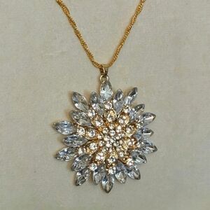 This a 2 1/2" sparkling sunflower pendant hangs from a 15" shining gold-tone chain. (B1)