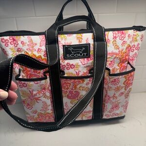 The Scout tote bag showcases a striking pink and black floral design, offering a perfect blend of style and practicality. Crafted from durable materials, it features black accents that enhance its structured look, making it ideal for everyday use.
