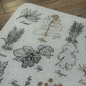 1975 vintage Vance Industries herb themed glass cutting board in excellent condition. Features a variety of herbs in black and gold on a white background.