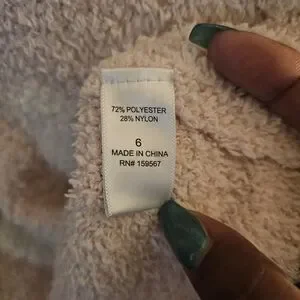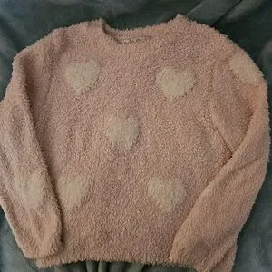 Soft pink sweater with cream heart patterns. Perfect for cozy days.