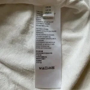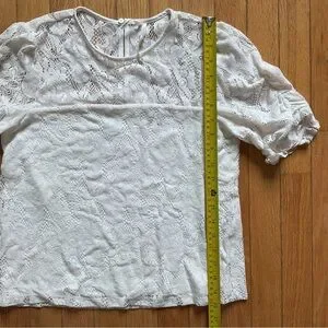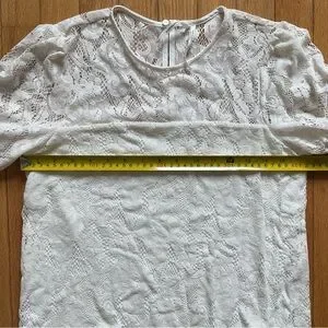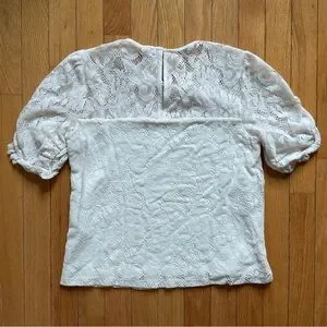 Excellent pre-owned condition, off-white lace top with ruffled puff sleeves. Body has interior lining, button closure on back, size XS.