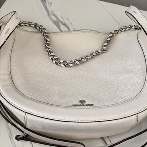 This Michael Kors shoulder bag is crafted in a pristine white hue, featuring a chic crescent shape and a sophisticated silver chain detail. Its minimalist design and smooth leather finish make it a versatile accessory for any occasion.