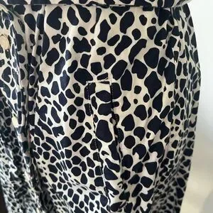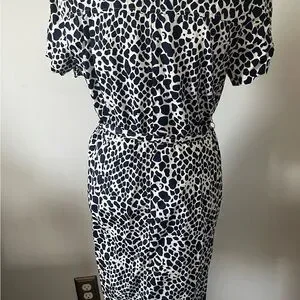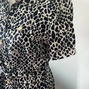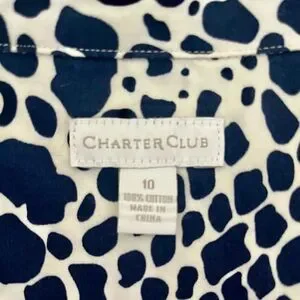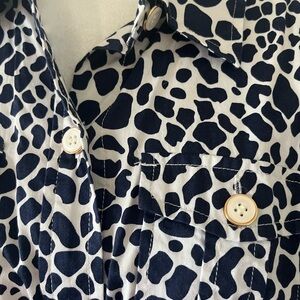 This fun animal print dress by Charter Club features a striking navy and white pattern, perfect for casual or work settings. The short sleeves and collared neckline add a touch of sophistication, while the sheath style ensures a flattering fit. Ideal for those seeking a versatile and stylish addition to their wardrobe. Pockets on chest and at waist. Will ship immediately. Make an offer.