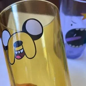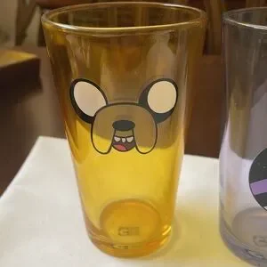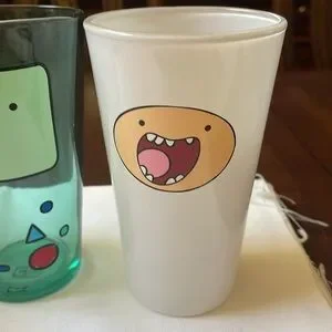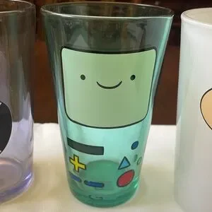 Enjoy wacky images from TV's Adventure Time animated series at your next party with this fun Adventure Time glass set! The Adventure Time Character Faces Pint Glass Set includes four pint glasses with character closeups. A purple glass features Lumpy Space Princess, a green glass features Beemo, a yellow/orange glass features Jake the Dog and a white glass features Finn the Human. "Mathematical!" The glasses are used, with wear, scratches. Made of glass, As pictured. As is. 6” tall 16 oz.