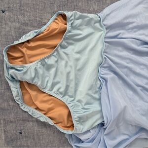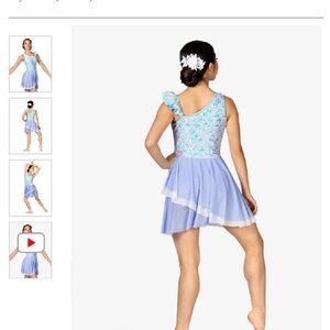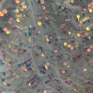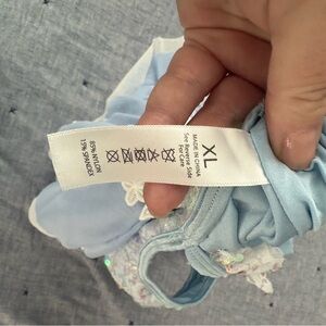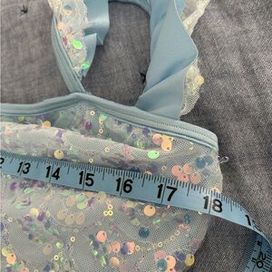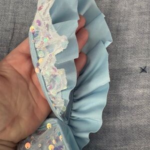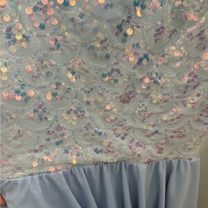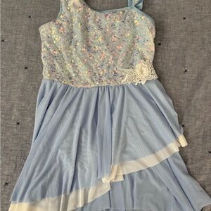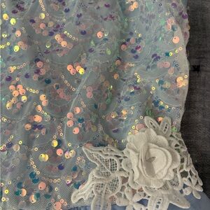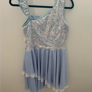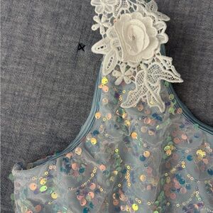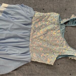 This enchanting “Whimsical Dreams Dress” features a sparkling blue design with delicate lace accents. Perfect for dress-up, dance, skating or special occasions. This fits a women’s size medium/large- bust DD 38. This was worn once for 10 minutes, perfect condition!