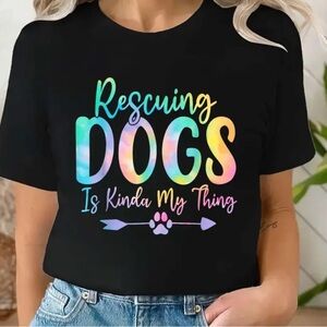 Celebrate your love for dogs with this stylish black t-shirt featuring a colorful 'Rescuing Dogs Is Kinda My Thing' design. Perfect for dog lovers.