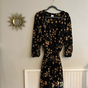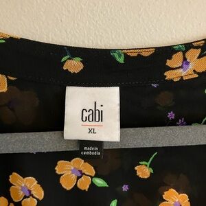 This casual dress/duster by CAbi features a scoop neckline and bishop sleeves, offering a relaxed yet stylish look. The black base is beautifully complemented by orange floral patterns, creating a striking contrast. Perfect for a casual outing, this dress combines comfort with elegance.