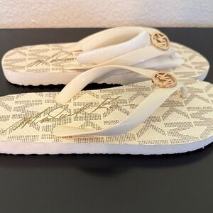 Elegant cream sandals with a signature gold emblem. Ideal for everyday style. NEVER WORN! Comes with original box.