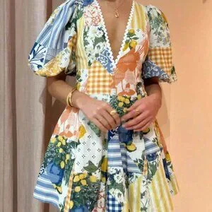 Multicolor Boho Women's Lemon Color Patchwork Wavy Print Mni Dress