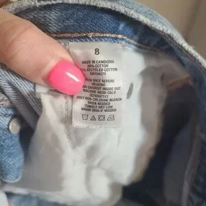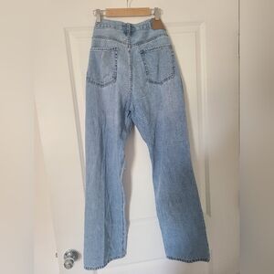 Stylish light blue jeans with a wide leg and ripped details. Perfect for a casual, chic look.