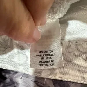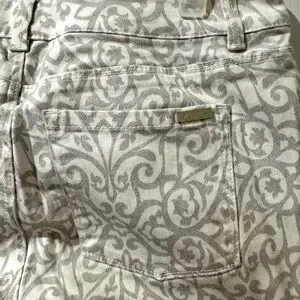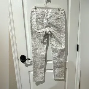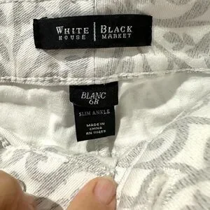 White and gray paisley print slim ankle jean by White House Black Market. Rhinestone Gem studs throughout. Size 6. Rise 9”, inseam 29”, waist 16” laying flat. 92% cotton, 6% elastrell, 2% Lycra