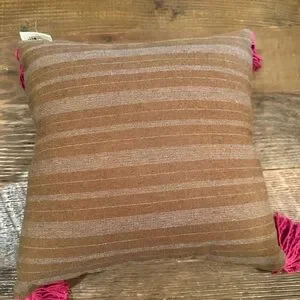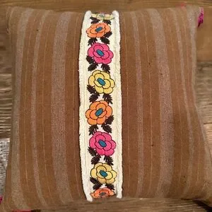 Charming brown pillow with vibrant floral embroidery. Accented by pink tassels. Perfect for adding warmth to any room.