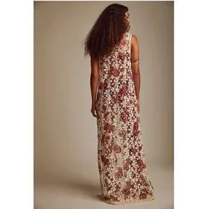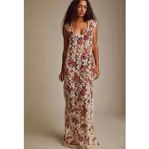 Elegant floral lace maxi dress featuring a blend of cream and pink hues. Perfect for special occasions.