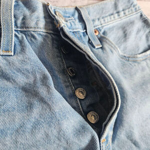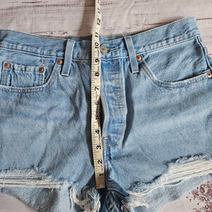 Levis Premium 501 shorts. Light wash, raw Distressed hem and button fly. About 10.5" rise and the waist is about 14.75". Excellent condition.