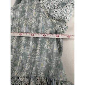 Breathe in soft, romantic charm with this American Eagle light blue babydoll top, adorned with a delicate dainty floral print and dreamy eyelet lace trim. The gently gathered empire waist creates a flattering, flowing silhouette with a touch of cottagecore whimsy and vintage-inspired sweetness.