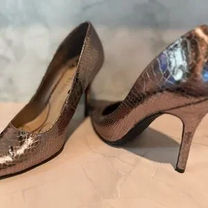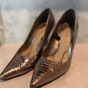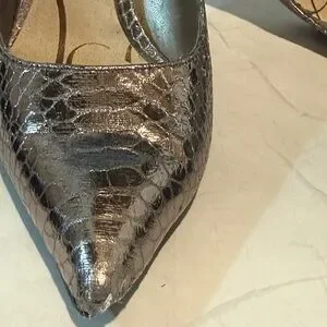 These Sam & Libby silver heels feature a sleek pointed toe design, perfect for adding a touch of elegance to any formal ensemble. The metallic finish enhances their luxurious appeal, making them an ideal choice for evening wear. With their sophisticated style, these heels are sure to complement a variety of outfits.
