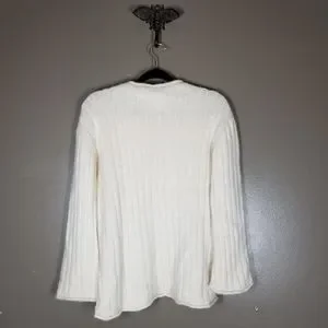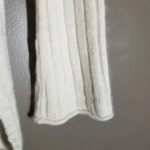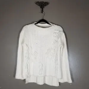 Mantari Angelica Alpaca fringe sweater. Super soft material. Step hem at the bottom with side vents. Fringe detail scattered on the front. Slight bell sleeve and mock neck. In excellent pre owned condition! Size large.