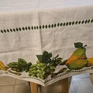 Enhance your dining experience with this elegant white tablecloth featuring vibrant green and orange accents. Perfect for adding a touch of sophistication to any meal.Made in Poland. Excellent condition.