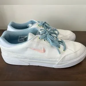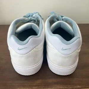 These Nike sneakers boast a sleek white leather and canvas upper with subtle blue accents, offering a fresh and modern look. Designed with a low-top silhouette and traditional lace-up closure, they provide comfort and style for everyday wear. The white rubber midsole and outsole ensure durability and a clean finish.