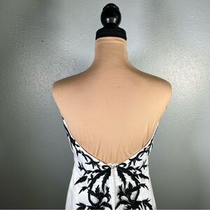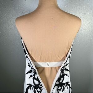 Stand out in this stunning glam formal gown featuring dramatic black embroidery over crisp white mesh. Designed in a flattering strapless sweetheart neckline with a structured bodice and inner elastic bust strap for support. The fitted mermaid silhouette flares into a soft tulle train for maximum impact. Elegant and dramatic — perfect for prom, pageants, black tie events, or theatrical moments.