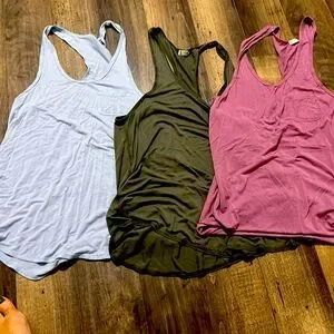 Set of three Free People tank tops. Includes light blue, olive, and mauve colors. Soft and stylish. Perfect for layering or wearing alone.