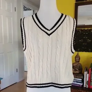 Cable Knit V-Neck Sweater Vest - Cream and Black