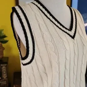 This stylish cable knit sweater vest features a classic V-neck design. The cream color is elegantly contrasted with black trim, making it a versatile addition to any wardrobe. Perfect for layering and adding a touch of sophistication to your outfit.