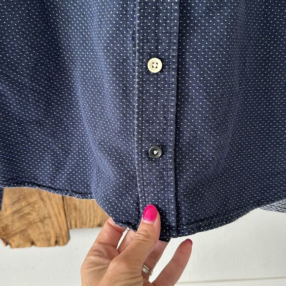 Dark blue shirt with a subtle pattern. Ideal for casual outings. Button-down style. Would say it fits like a small.