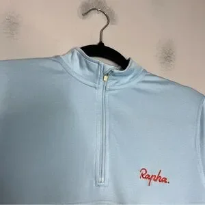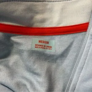 Its quarter-length zip harkens back to earlier days, and its traditional, clean color ways remind us of a classic kit. It is light blue with a contrasting orange bar across the chest.