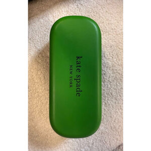 Kate Spade New York sunglasses, new with tags and box. The sunglasses feature brown lenses and a blue and multicolored frame. The case is a bright green with the brand name printed on the side. The inside of the case is white with "HELLO SUNSHINE" printed in black. The sunglasses come with a black and white polka dot lens cloth.
