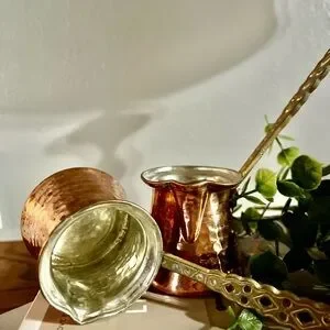Elegant copper Turkish coffee pot set with intricate handles. Perfect for brewing traditional coffee.