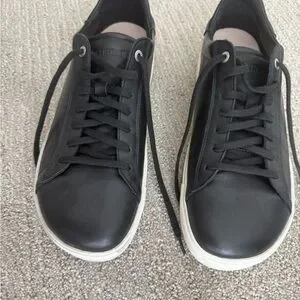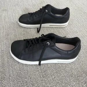 Step into style with Birkenstock's black and white sneakers, featuring a sleek leather upper and a contrasting white rubber sole. These minimalist sneakers offer a classic low-top design with a traditional lacing system, perfect for any casual or semi-formal occasion. US size is 12. Worn one time only. Only wear shows on bottom soles.