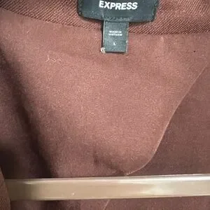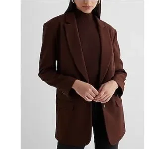 This Express blazer in a rich chocolate brown features classic notched lapels and a relaxed, slightly oversized fit. Its single-breasted design and structured shoulders offer a professional yet versatile look, perfect for both formal and casual settings.