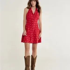 Crafted from a lightweight linen blend, this breezy silhouette is perfect for sunny adventures. The halter neckline beautifully frames the face and highlights the collarbone, while the mini length lets you show off your favorite boots. Available in two vintage-inspired custom prints, each design speaks to our Western DNA in a fresh, wearable way. The bold red spur print offers a playful nod to classic cowboy heritage, while the purple floral version adds a soft, feminine touch with intricate lace details. This dress is a go-to for any warm-weather occasion.