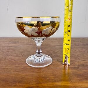 Elegant and eye-catching, this pair of vintage coupe glasses from Western Germany features a luxurious gold cut-to-clear design with beautifully etched grapevine and leaf motifs. These crystal glasses exude sophistication and are perfect for champagne, cocktails, or display.