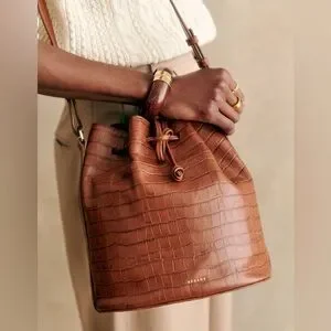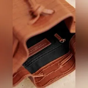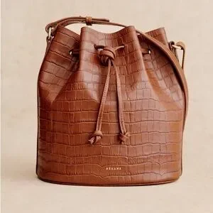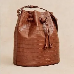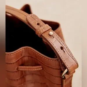 Elegant brown bucket bag. Croc-embossed leather. Drawstring closure. Stylish and versatile.